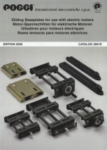 Poggi Adjustable Motor Bases are designed to precisely align motors for belt drive systems or to be used to adjust center-distance for variable speed belt drive systems. Bases are made of sheet steel or cast iron. Variable speed bases are made with hand wheel for easy speed adjustment by simply changing center distance. Catalog is 4 pages, in English/Italian/German/ and French languages. |